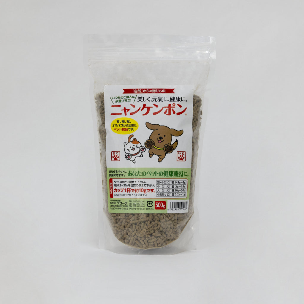NYANKENPON is pellet-shaped pet food made from the essences extracted from pines, Japanese cypress, and plantains. Safe and harmless to your pets, it has gained a good reputation for improving the health, color, and luster of fur, decreasing the odor of excrement, repelling fleas and ticks, and improving body shape and skin.